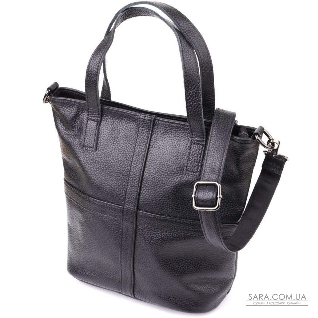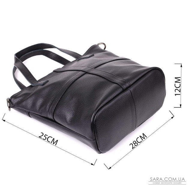 Стильна чорна шкіряна сумка у формі трапеції – це універсальний аксесуар, що поєднує сучасну елегантність та практичність. Вона виконана з натуральної шкіри високої якості, відрізняється щільною структурою та привабливим лаконічним силуетом. Сумка закривається на блискавку і має зручне основне відділення, всередині якого передбачена потайна кишеня на блискавці, кишеня-перегородка на блискавці та відкрита кишеня для дрібниць. Тверде дно допомагає сумці зберігати форму, а фурнітура кольору темного срібла наголошує на вишуканому характері моделі. Для зручності носіння передбачений знімний ремінь, що робить сумку комфортною як у повсякденних, так і більш урочистих образах.