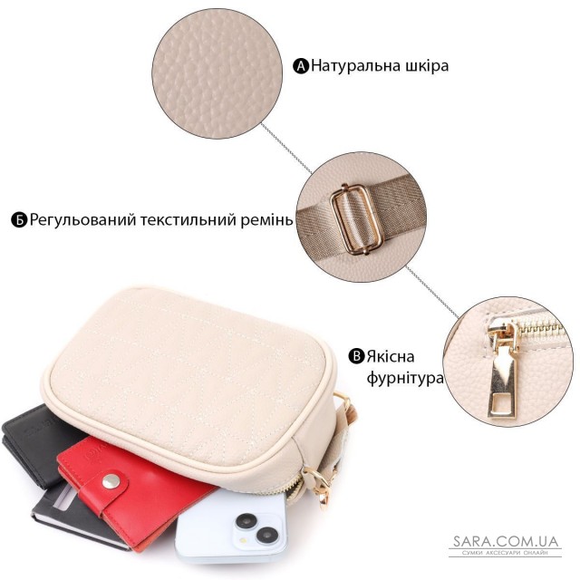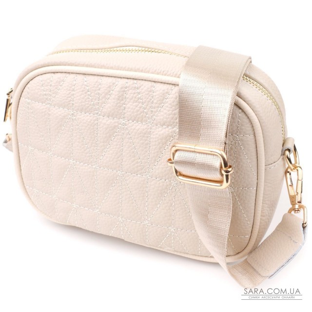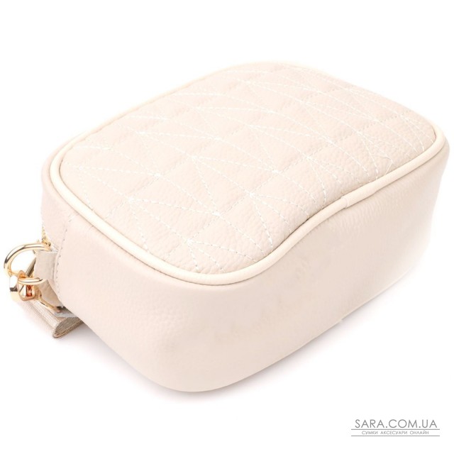 Сумка жіноча в ніжному білому кольорі з натуральної шкіри стане елегантним і вишуканим акцентом вашого образу. М'яка, але щільна шкіра приємна на дотик і підкреслює високу якість виробу. Компактна чітка форма робить модель акуратною та зручною, а стібка на лицьовій стороні додає витонченого дизайнерського характеру. Сумка закривається на блискавку, всередині розташоване основне відділення з кишенею на блискавці та відкритою кишенею для дрібниць, а на тильній стороні є зовнішня кишеня на блискавці для швидкого доступу до потрібних речей. Знімний текстильний ремінь, що регулюється, забезпечує комфорт при носінні, а фурнітура під жовте золото гармонійно відтіняє світлий білий тон шкіри. Ця сумка стане універсальним аксесуаром для повсякденних виходів та особливих випадків, підкреслюючи витончений смак та любов до якісних матеріалів.