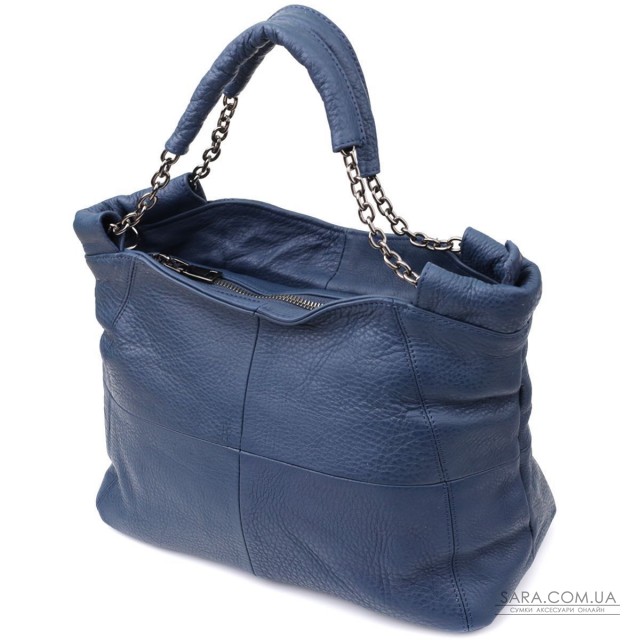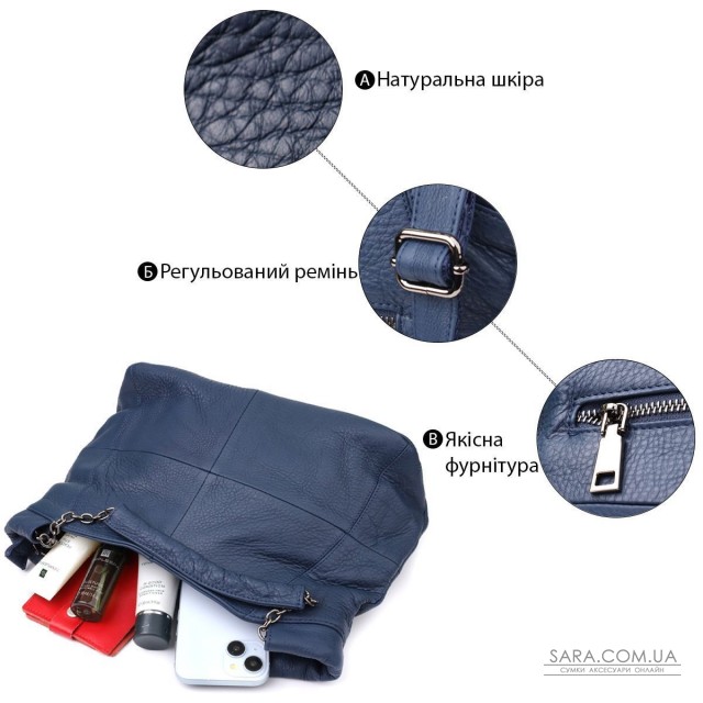 Жіноча шкіряна сумка Vintage синього кольору – стиль та функціональність у гармонійному поєднанні. Ця витончена модель виконана з натуральної шкіри насиченого синього відтінку, який надає образу глибини та витонченості. Універсальний синій колір легко вписується в різні стилі – від ділового до повсякденного, наголошуючи на вашому гардеробі.
