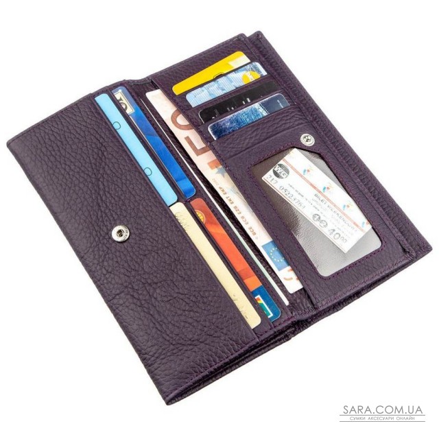 Шикарний жіночий гаманець з візитницею для жінок з відмінним смаком і чудовим почуттям стилю. Виготовлений він з відмінної зносостійкої натуральної шкіри високої якості, яка має м'яку зернисту фактуру. Виріб має розкішний темно-фіолетовий колір, який надає йому особливого шарму. Такий гаманець є універсальним, тому підійде для будь-якокої жінки. Візитниця знаходиться окремо від основного гаманця і закривається на кнопку, як і сам гаманець. Монетниця також знаходиться на зовнішній стороні аксесуара і закривається на блискавку. Упаковано виріб в щільну картонну коробку білого кольору з логотипом виробника.