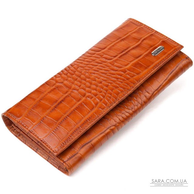 Виріб виконаний з натуральної фактурної шкіри рудого кольору з тисненням під крокодила. Матеріал виглядає ефектно, приємний на дотик і добре підходить для щоденного використання. Горизонтальний формат робить модель зручною для тих, хто цінує місткість і порядок у речах.