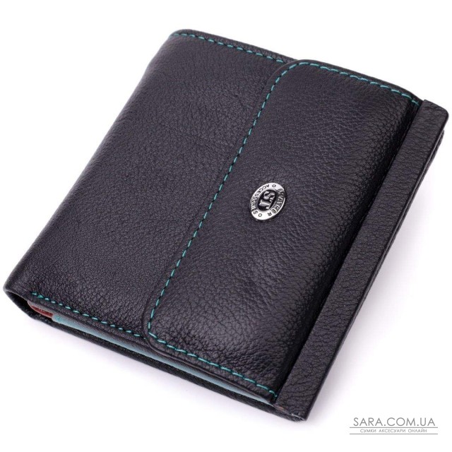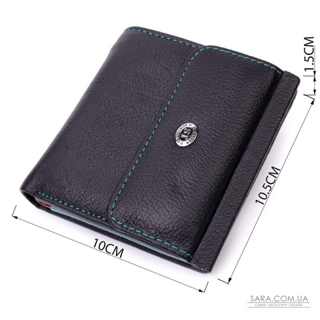 Портмоне для жінок середнього розміру із натуральної шкіри найвищої якості. Акцентом цього гаманця є колір, точніше кілька кольорів – він чорного кольору зовні та багатобарвний усередині. Аксесуар складається з двох містких відділень для купюр, кишені на блискавці, чотирьох осередків для карт, прихованої кишені, прозорої кишені та кишені для монет. Зовні виріб прошитий рівним рядком бірюзового кольору по краю і прикрашений металевим логотипом компанії виробника, який розміщений вгорі посередині. Портмоне доповнено надійною фурнітурою та міцною підкладкою. Укомплектований гаманець у фірмову картонну коробку білого кольору.